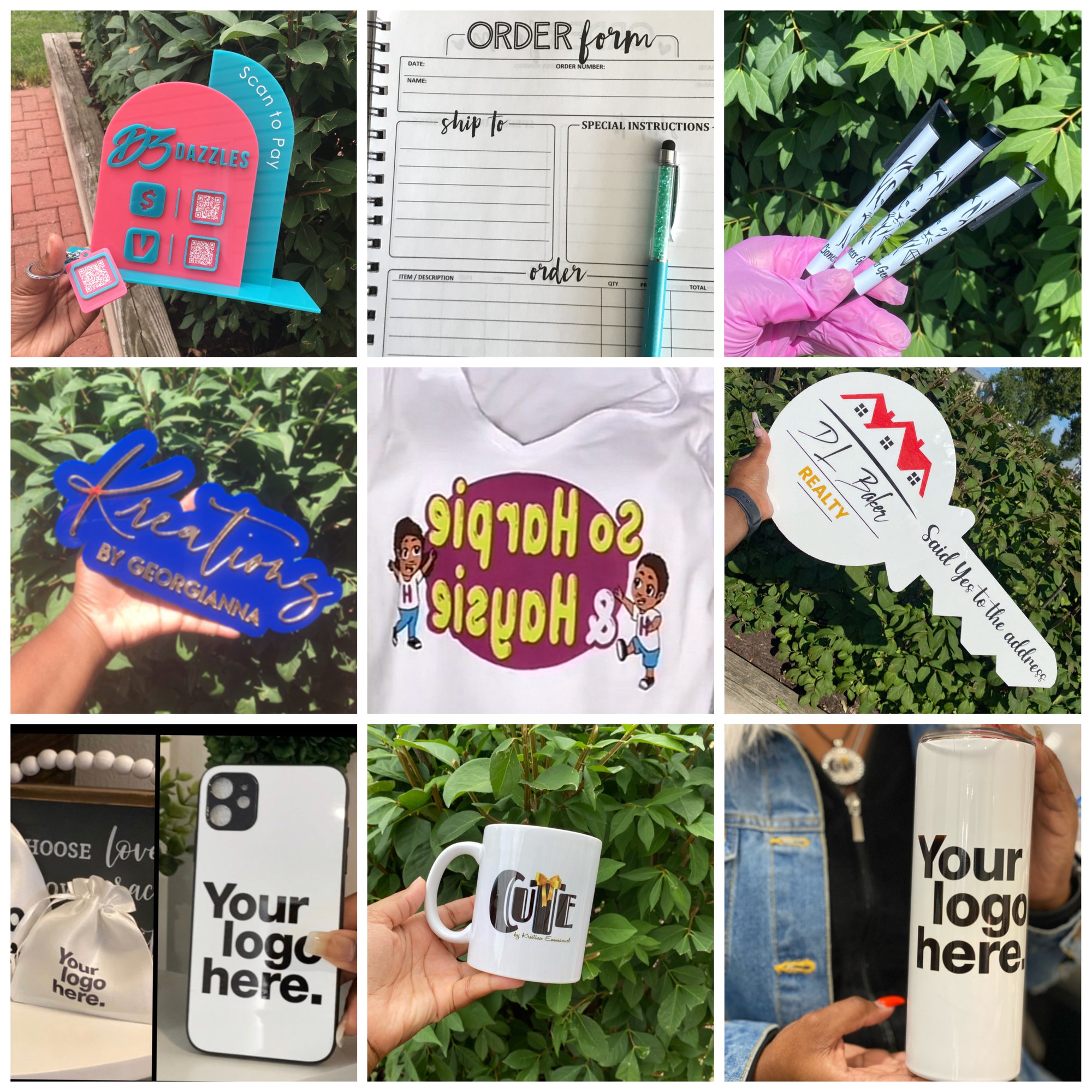 The pens, cellphone cases, mugs, WHITE shirts, and tumblers are also produced using sublimation printing.
